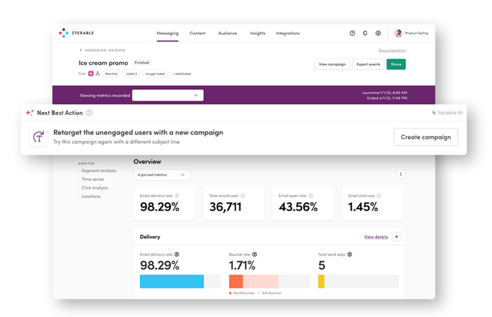 Lastly, Iterable's platform is AI-powered, allowing brands to increase performance and efficiency with predictive audiences and insights, content generation tools, and user-level optimization.