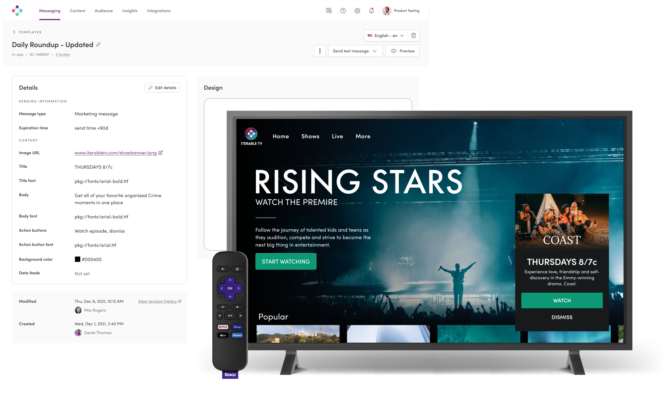 Iterable continues to expand its channel offerings, and with the addition of Roku, marketers can build cohesive in-app messaging experiences across mobile, desktop, and connected TV.
